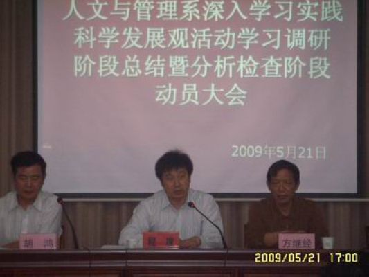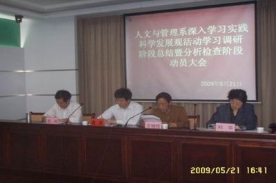 5月21日下午,人文与管理系在图书馆十楼视频会议室召开深入学习实践科学发展观活动学习调研阶段总结暨分析检查阶段动员大会,校党委副书记、纪委书记程度出席会议并作指导讲话,系党总支书记方继经、系主任胡鸿、全体教工党员、学生党员、入党积极分子代表参加了会议,会议由系副主任刘华主持。