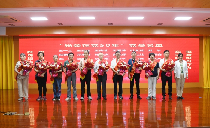 在欢快喜庆的旋律中,党委书记夏劲松向“光荣在党50年”党员代表颁发纪念章,预备党员向老党员们敬献鲜花。校领导依次为受到表彰的集体和个人颁发证书和奖牌。