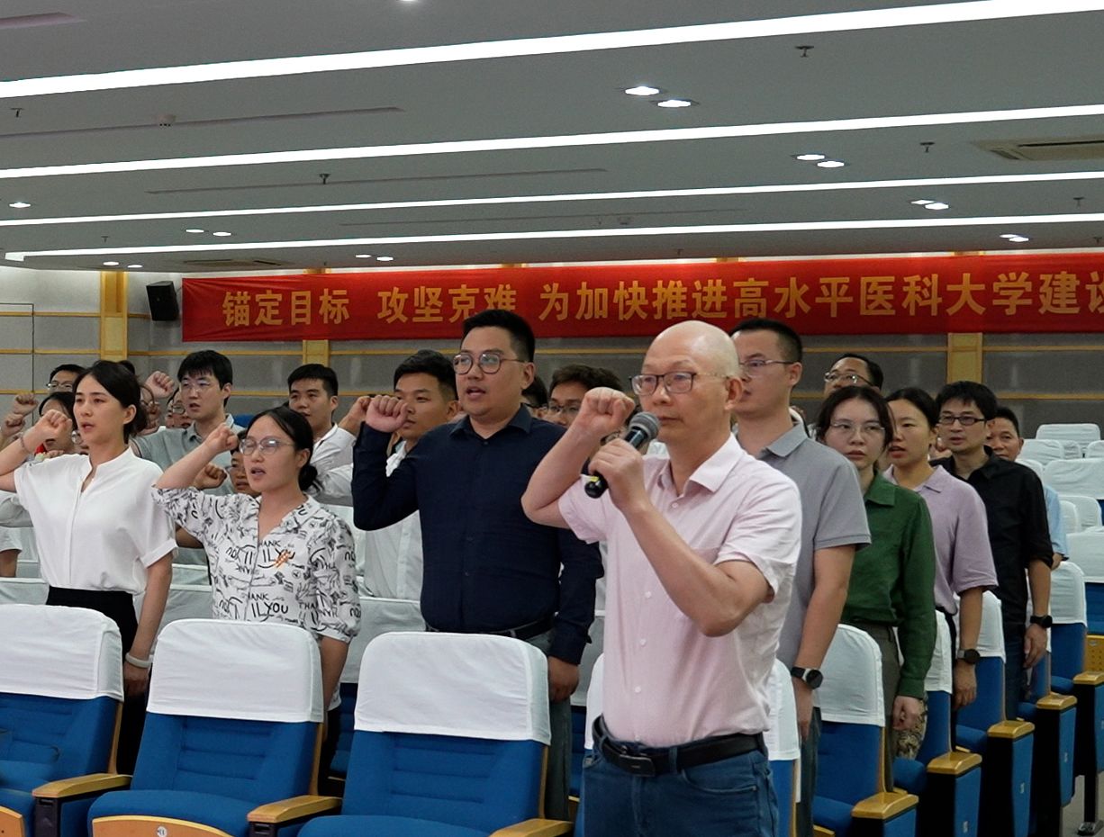 党委书记夏劲松代表学校党委和行政对新教师正式入职表示欢迎。她希望新教师,一要尽快完成身份转变,实现从受教育者向教育者、从知识获取者向知识传授者的转变;二要正确认识教学和科研的关系,实现教学科研齐头并进;三要做好职业生涯规划,明确个人发展定位和目标,处理好小我和大我的关系,主动融入到相应的科研团队。结合习近平总书记关于教育的重要论述及最新出台的《中共中央 国务院关于弘扬教育家精神加强新时代高素质专业化教师队伍建设的意见》,希望大家在言传身教中、在实践活动中、在教育追求中践行教育家精神。同时,夏劲松勉励新教师们铭记誓言,争做有理想信念、有道德情操、有扎实学识、有仁爱之心的“四有”好教师,大力弘扬教育家精神,逐渐成长为具有教育家精神特质的教育家型教师,竭力为培养社会主义建设者和接班人、为建设高水平医科大学贡献智慧和力量。