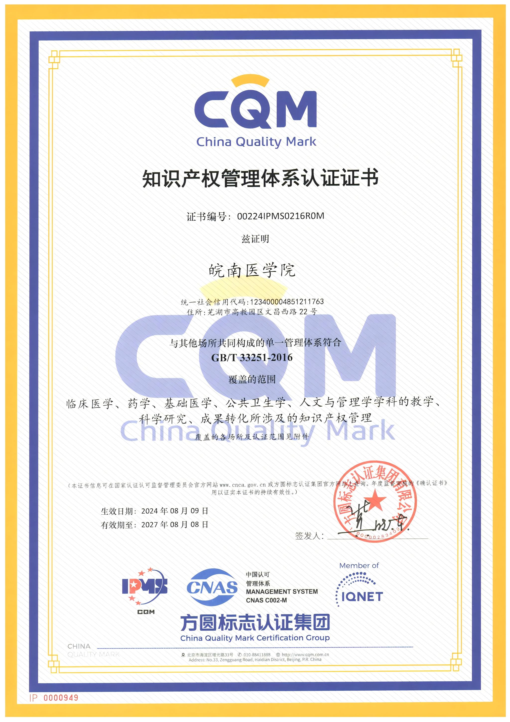 知识产权管理体系认证证书