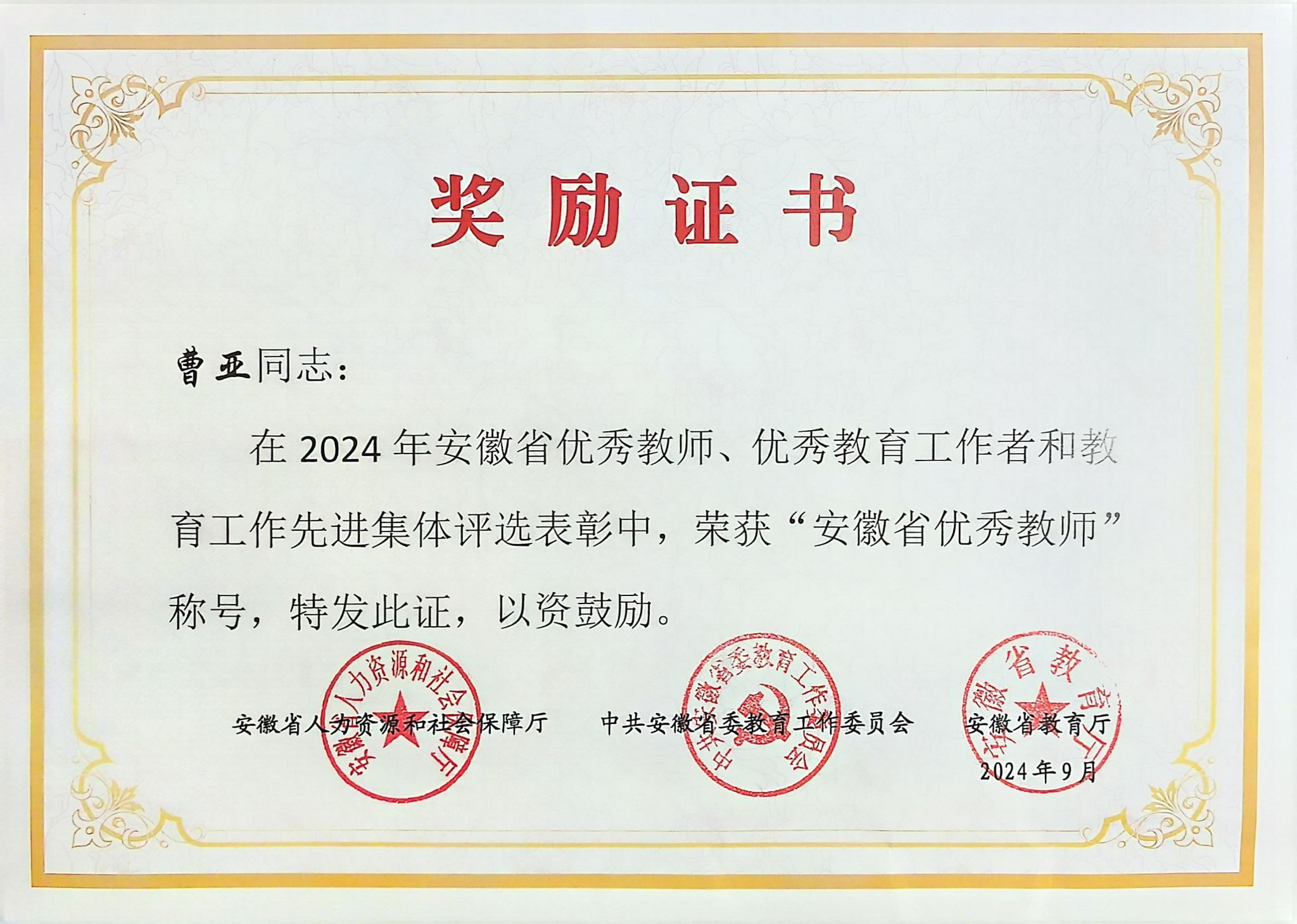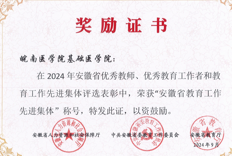 近日,安徽省人力资源和社会保障厅、中共安徽省委教育工委、安徽省教育厅联合下发了《关于表彰2024年安徽省优秀教师、优秀教育工作者和教育工作先进集体的决定》,我校曹亚老师获2024年“安徽省优秀教师”称号,基础医学院获2024年“安徽省教育工作先进集体”称号。