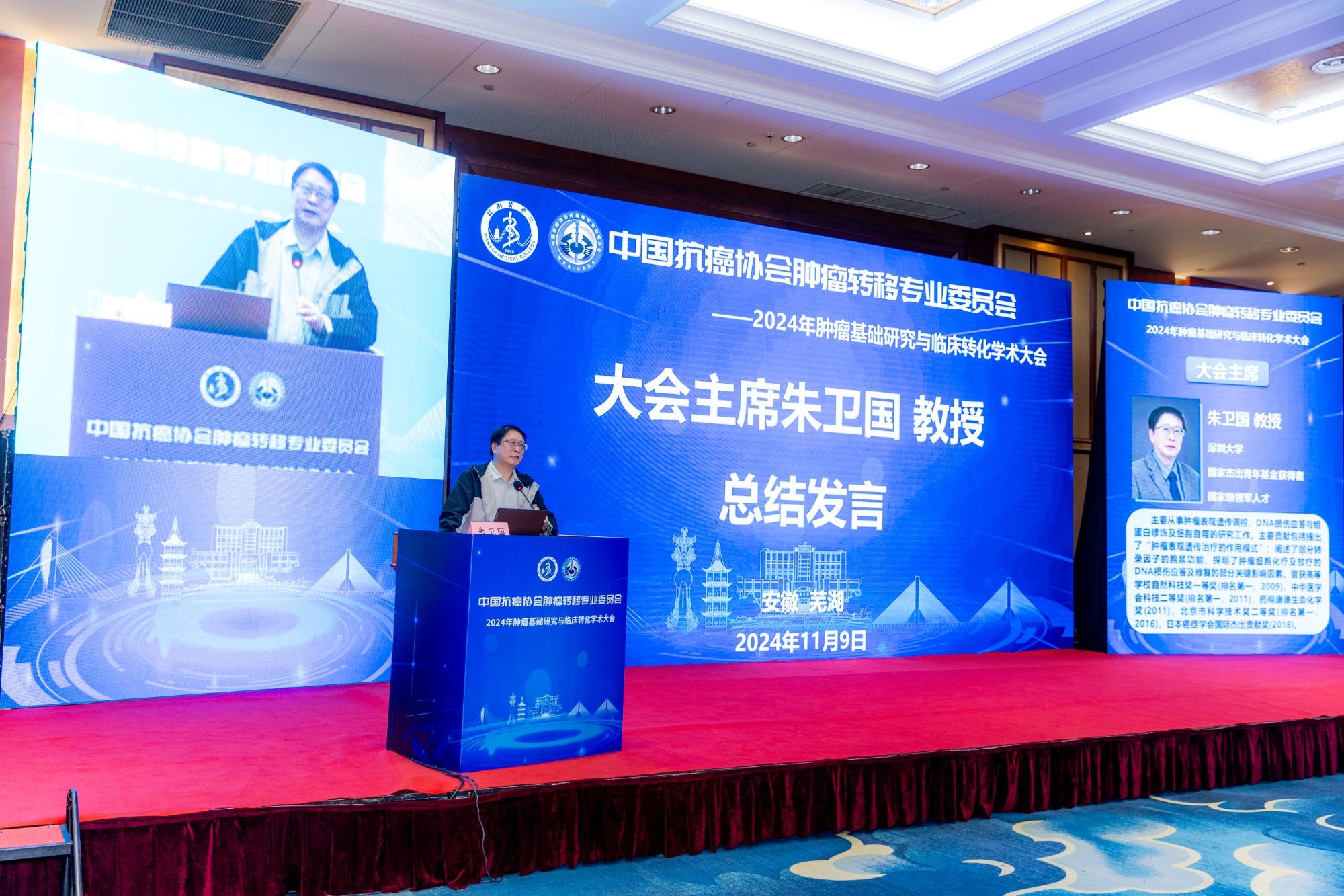 大会主席、深圳大学朱卫国教授作会议总结,指出本届大会在大家的共同努力下,取得了丰硕的成果;参会专家学者以饱满的学术探讨激情与活力,交流学术最前沿,充分展现了我国在癌症研究领域的进步和水平。希望参会师生能将此次交流中的所思、所得,融入到未来的研究中,不断突破自我,为肿瘤学术研究和防治事业贡献更大的力量。朱卫国教授还对会议筹备和组织给予了高度评价,对我校的大力支持表示感谢。