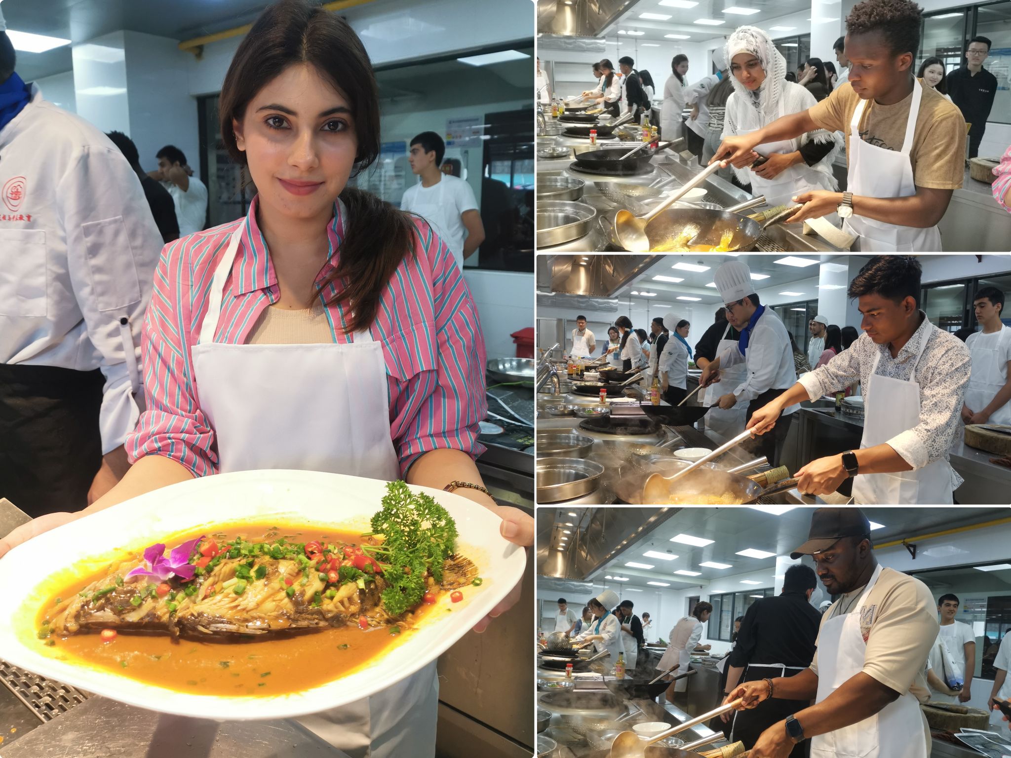 此次国际学生们还深入体验了徽菜文化。在专业老师指导下,他们学习制作了徽州名菜——臭鳜鱼。从清洗食材、腌制鳜鱼到调味烹饪,学生们亲自参与了每一个环节。当品尝到自己亲手制作的臭鳜鱼时,学生们脸上洋溢着满足和自豪的笑容,直呼“美味”,切实感受到了舌尖上的徽州味道。