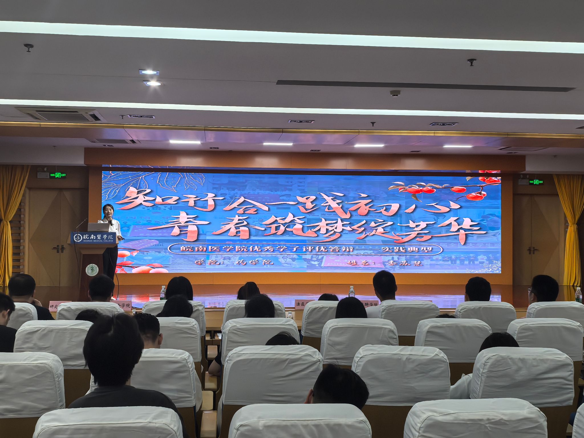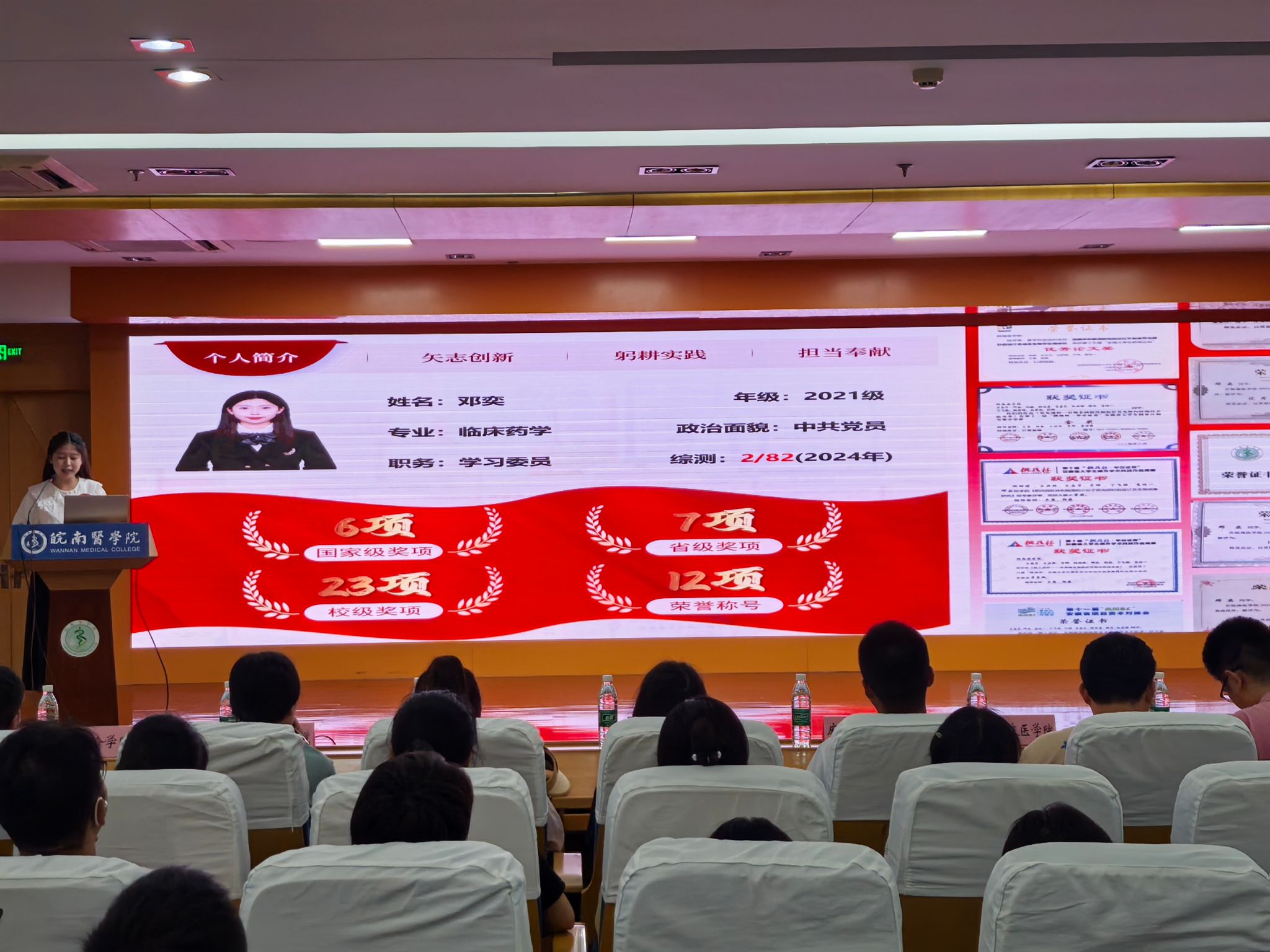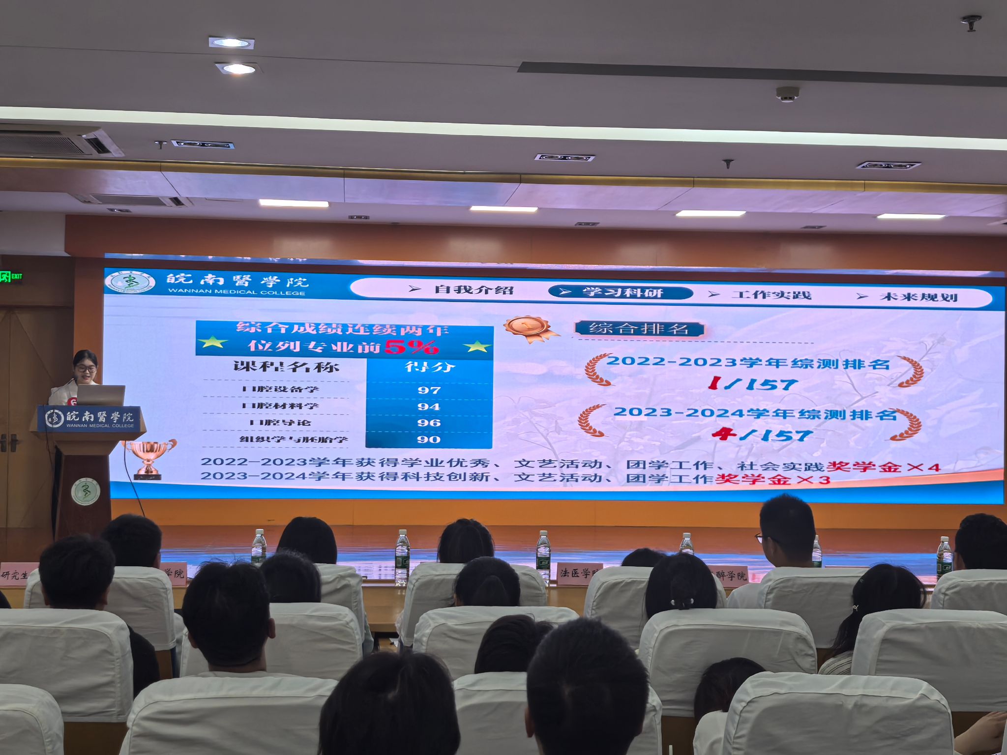 汇报现场,聚光灯下20名选手依次登台,通过PPT展示、主题演讲、舞台表演等多种形式,声情并茂地分享了他们的成长历程、奋斗故事、心路感悟与未来展望,亮点纷呈、催人奋进,展示了勤奋好学、全面发展、实践创新、自立自强、无私奉献的精神面貌。最终,吴蓓(法医学院)、邓奕(药学院)、黄宇(临床医学院)、纪阳斌(麻醉学院)、芮尔安(公共卫生学院)、王雨桐(临床医学院)、章译文(医学影像学院)、周鑫成(麻醉学院)、李苏慧(药学院)、胡静怡(口腔医学院)等10名同学凭借优异表现,拟获2024年度十大“优秀学子”荣誉称号。