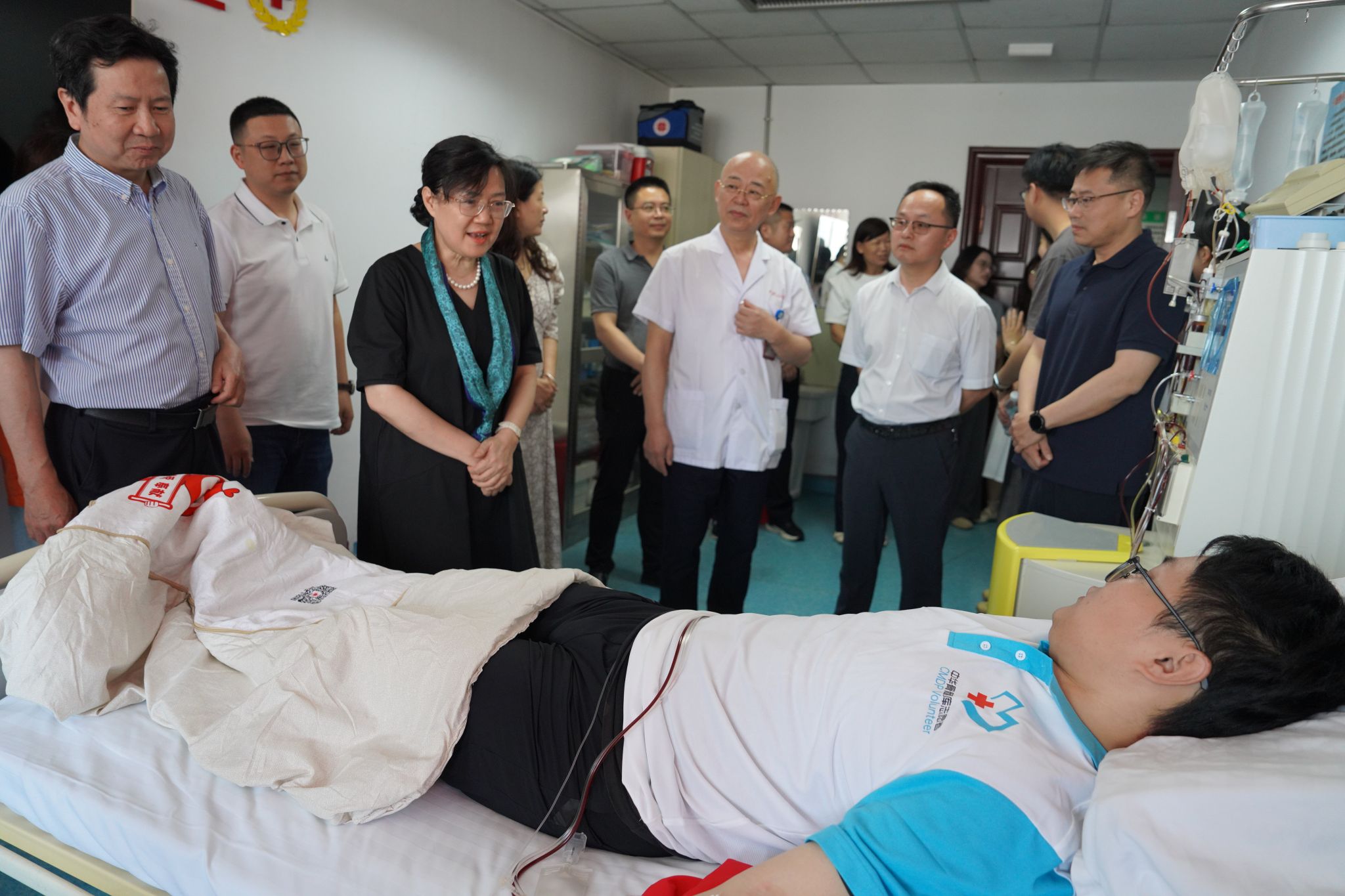 捐献当日,校党委书记夏劲松率学生处、临床医学院师生代表,与一附院相关负责人共同来到病房看望熊俊杰同学。夏劲松代表学校向熊俊杰同学致以深切关怀与诚挚慰问,并给予高度赞誉。她强调,熊俊杰同学的大义善举意义重大,他不仅以实际行动挽救了患者生命,更以医学生的使命担当诠释了对生命的敬畏与守护。这一行为如同一面鲜明的旗帜,为全校师生树立了热心公益、无私奉献的典范。她殷切期望广大师生能以熊俊杰同学为榜样,将这份大爱精神不断传承发扬,让医者仁心与奉献情怀在校园中蔚然成风,凝聚成推动社会向善的强大力量。
