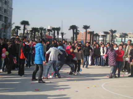 12月7日上午,护理学系第四届“阳光杯”体育联赛在篮球场正式拉开帷幕。比赛项目分为拔河和踩气球两个项目,2007、2008级共九个教学班的代表队参加了比赛。 在拔河比赛中,各代表队相互抗衡。其中以2007级第一教学班和第四教学班争夺冠军的比赛尤为精彩,比赛历经三个回合,第一教学班代表队最终险胜对手,夺得了此次比赛的冠军。2008级第二、一教学班代表队具有“初生牛犊不怕虎”的气势,他们一鼓作气,屡破强敌,并最终取得了第三名和第四名的好成绩。