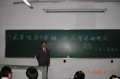 11月12日晚七点,人文与管理系08级全体同学在西104教室聆听了中国教育专家委员会委员、中国首批教育咨询师、奥运火炬手薛保红老师关于大学生职业规划的讲座。这次讲座是我系“庆学校五十华诞,创人管崭新明天”的系列活动之一。08级辅导员吴映辉老师出席并主持了本次讲座。