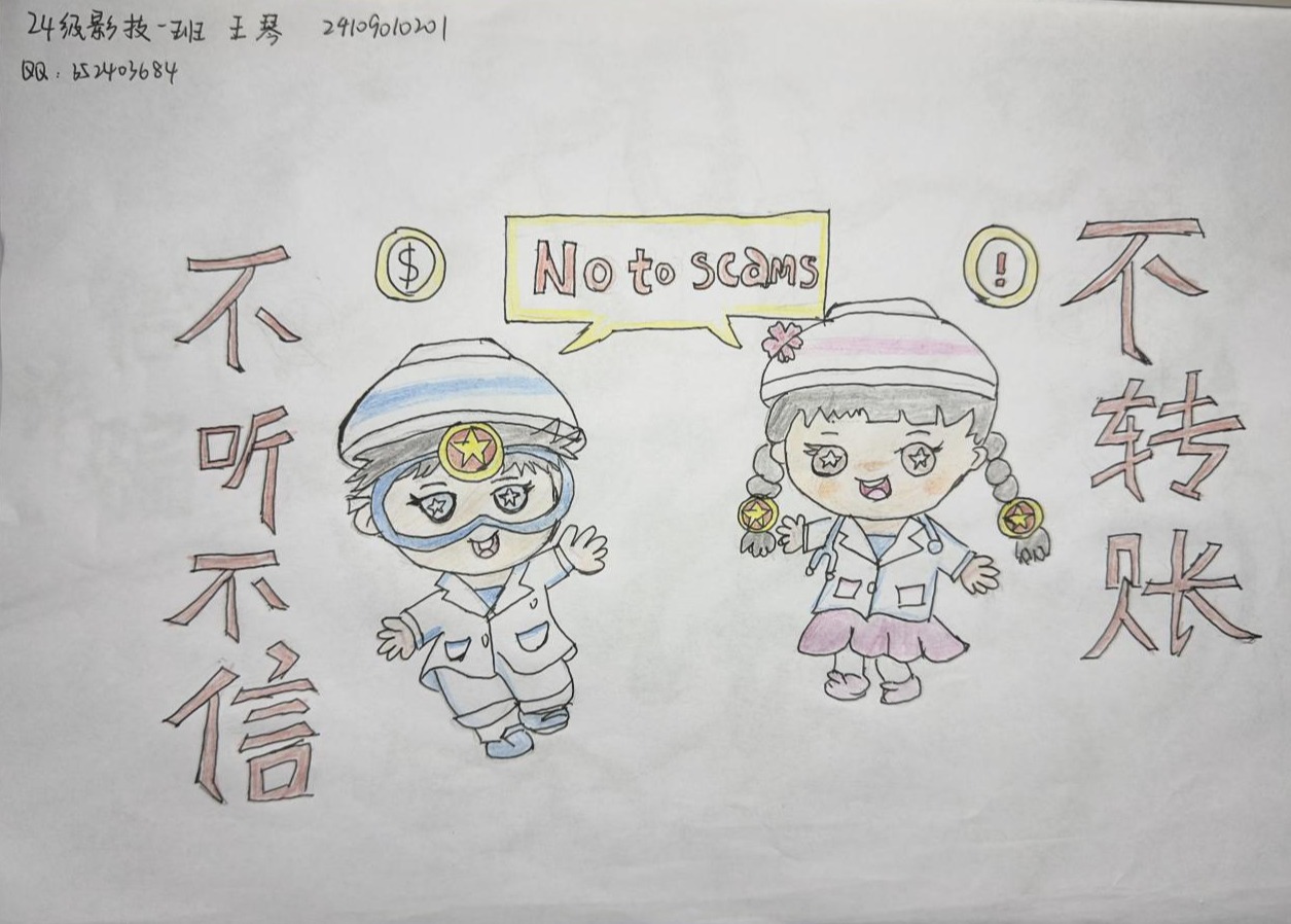 画里识诈影,反诈主题绘画比赛。绘画大赛凭借新颖的形式成为活动亮点,吸引了众多同学参与。同学们紧扣“不听、不信、不转账”“国家反诈APP装了吗”等核心主题,充分发挥创意灵感。他们巧妙运用水彩、油画、漫画等多样化绘画形式,设计出风格迥异、生动有趣的作品。这些充满巧思的绘画作品,以鲜活、接地气的方式传播反诈知识,让严肃的反诈宣传变得生动有趣,更易深入人心。