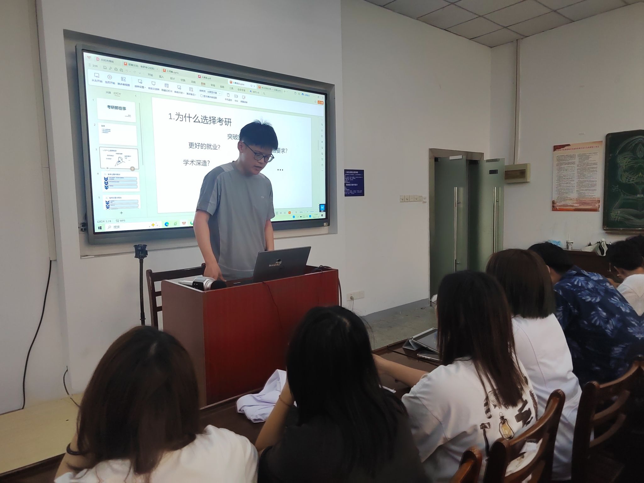 曹俊杰同学今年成功考取我校法医学研究生。他以“考研那些事”为题,以轻松诙谐的语言与学弟学妹们分享考研心路历程。他介绍了为什么选择考研、备考规划与过程、挑战与应对等三方面内容,建议大家列出每日学习计划,坚持劳逸结合,提高学习效率,表示“考研不是无间道,而是开往春天的列车。”