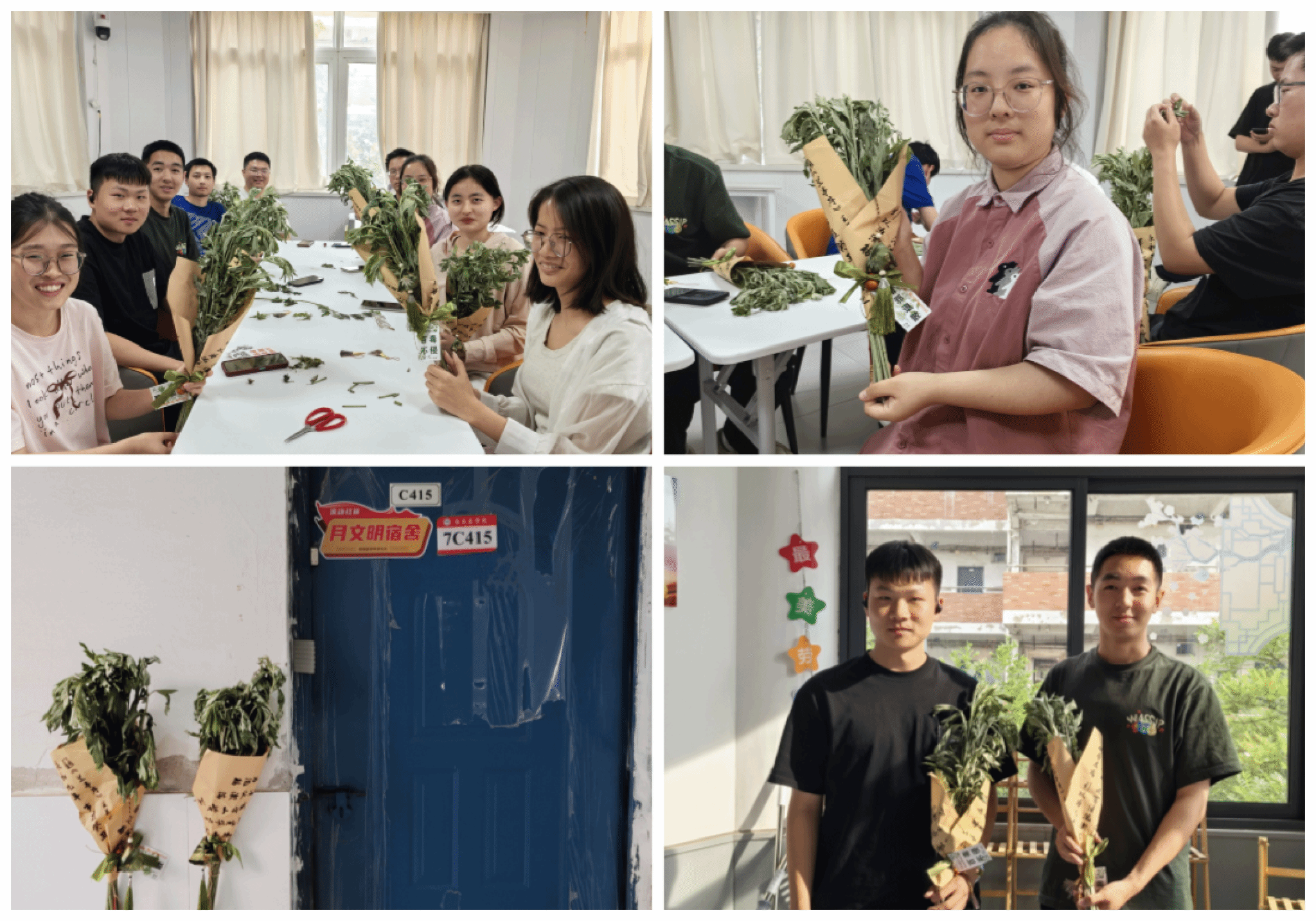“清明插柳,端午插艾。” 艾草在端午节有特殊的寓意,承载着古人对健康、平安的美好期许。5月30日,社区开展端午艾草花束DIY制作活动。活动中,同学们纷纷动手,精心挑选艾草枝叶,巧妙搭配色彩,用心缠绕丝带,再点缀上小巧的香囊、五彩的葫芦等装饰。在制作过程中,大家互相交流、互相帮助。同学们表示:“自己做的艾草花束比买的更有意义,不仅保留了传统意义,还能装点生活。”制作完成后,同学们将这些艾草花束装点在寝室门前,赠予师长、同学,这不仅延续了驱虫避瘟的传统寓意,更彰显着医学生 “悬壶济世” 的职业担当。
