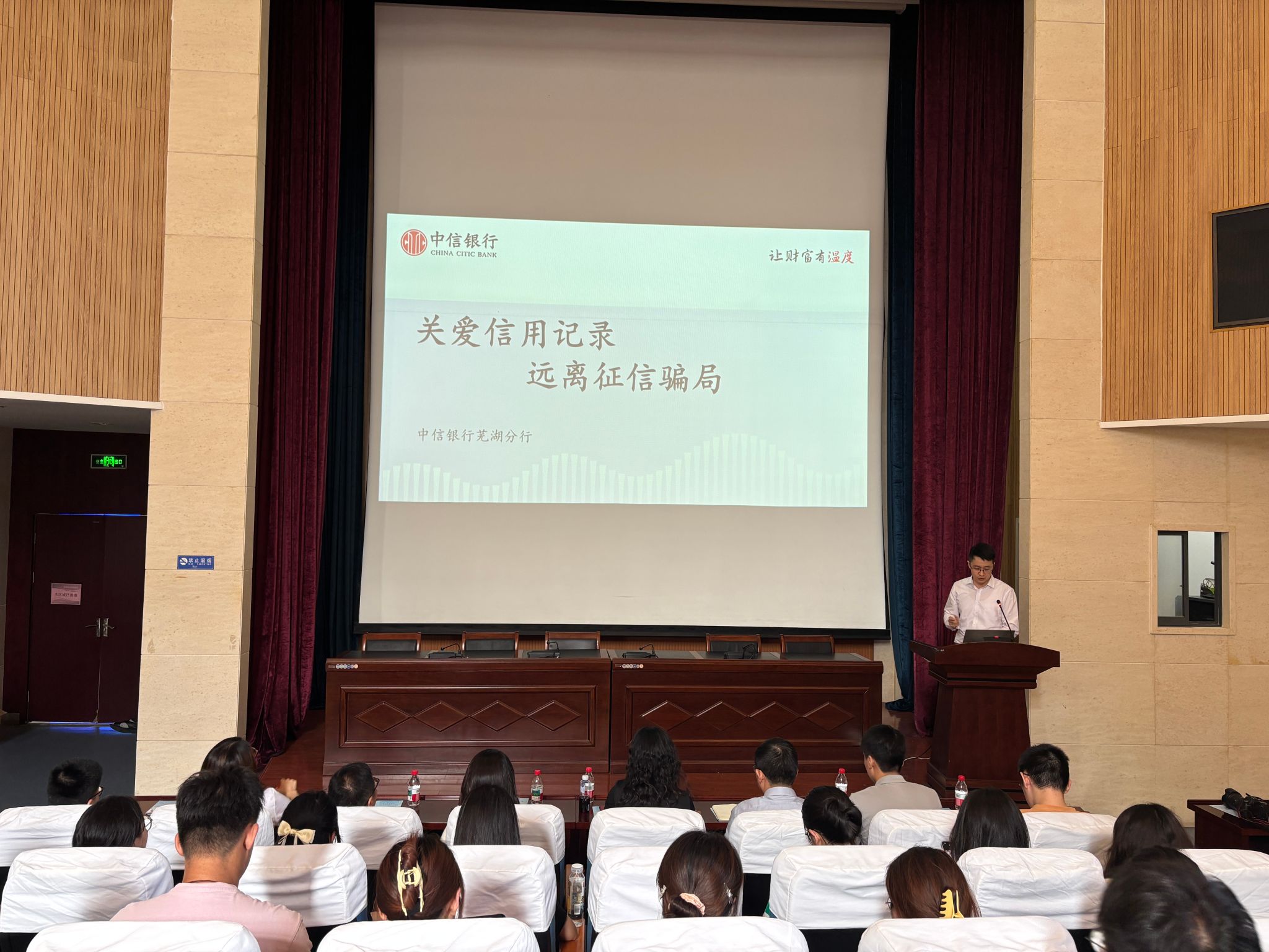 中信银行芜湖分行工作人员以“关爱信用记录 远离征信骗局”为主题,详细介绍了征信的具体含义、征信记录的重要性以及如何保护好个人金融信息,让大家深入了解征信的相关知识;与在座同学分享了征信案例,对助学贷款的还款注意事项进行了重点说明,并提醒在校学生要警惕“征信修复”陷阱,呼吁同学们理智消费,避免征信污点、征信诈骗,珍爱个人信用记录。在“征信知识快问快答”互动环节中,同学们积极参与,在轻松氛围中加深了对征信的理解,达到了良好宣传效果。