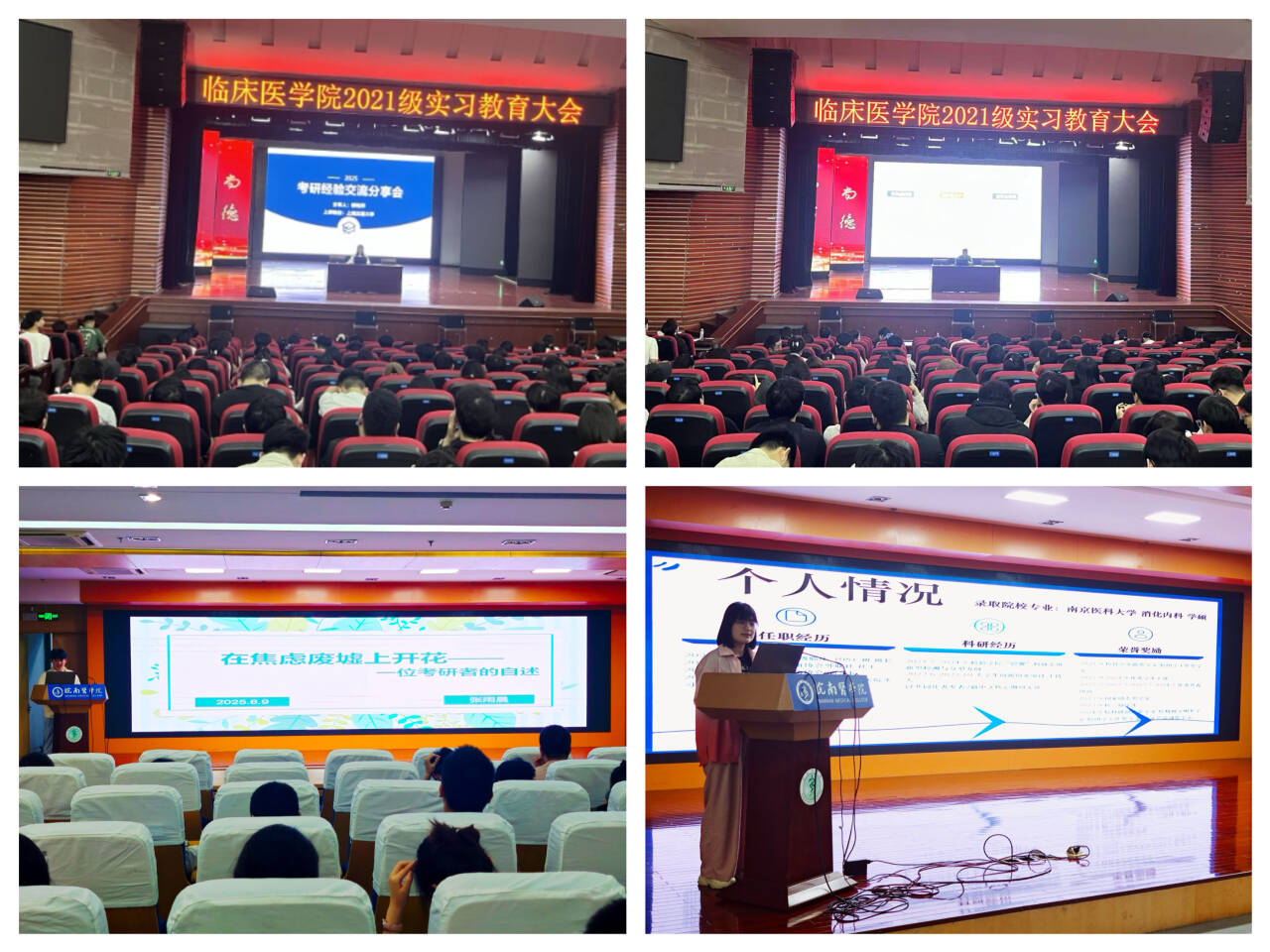 经验交流,医路经验齐开拓。5月26日,两位临床毕业生代表在大学生活动中心大礼堂与即将实习下点的600余名学弟学妹们开展经验交流,围绕专业课程学习方法、临床实习实践经验及职业发展规划等进行交流。6月9日,三位临床毕业生代表在图书馆三楼报告厅举办的第六期“临床青年说”系列朋辈分享会上,与2022级、2023级、2024级共300余名同学分享他们的科研学习经历、临床实习心得及考研复习计划等。