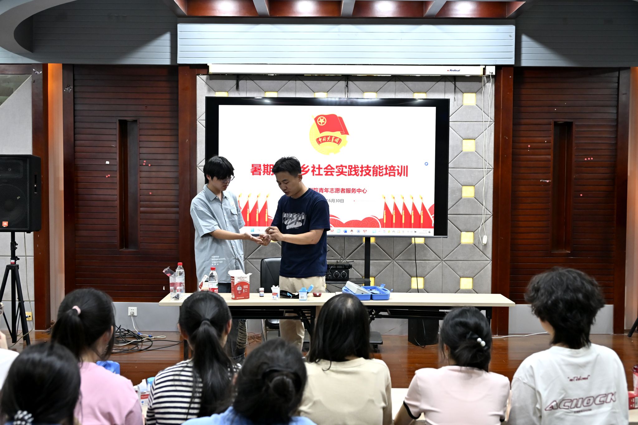 6月底,实践团成员们在期末考试后便立即投入到紧张的筹备工作中,从场地协调、物资采买到宣传策划、安全教育,全体成员全力以赴、热情高涨。为提升团队医疗服务能力,特邀护理学院老师为团队成员做义诊技能培训。队员们开展“杏林小讲堂”集体备课,就团体心理辅导、医学科普等主要课程内容进行多次讨论、备课与试讲。6月27日下午,校团委召开行前动员会,重点强调了组织纪律与安全保障,并对活动开展提出希望要求,确保本次“三下乡”社会实践活动安全有序开展。