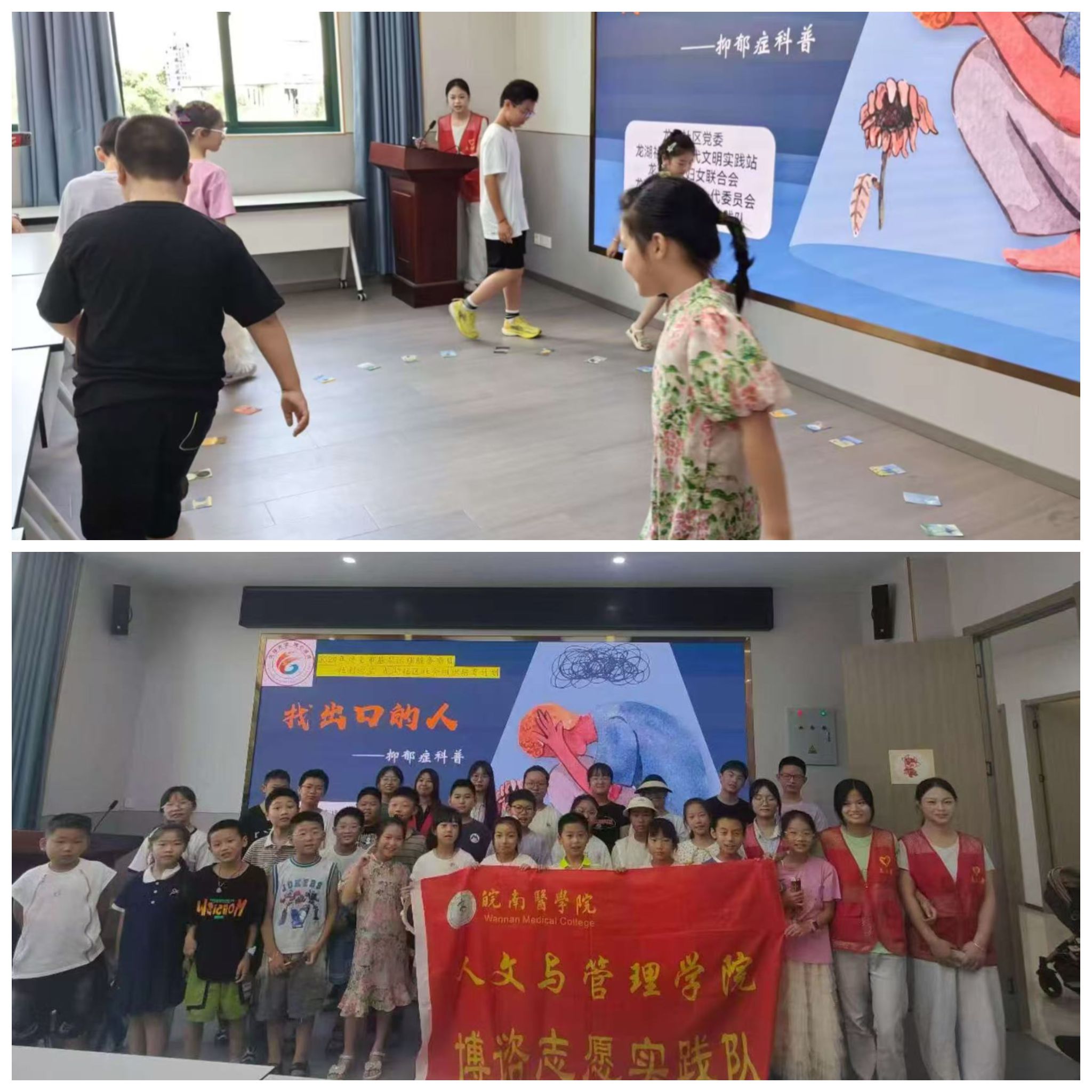 为启蒙儿童心理健康意识,播撒积极心态的种子,人文与管理学院博谘实践队于7月初走进龙湖社区,分别开展“找出口的人——抑郁症科普宣讲”与“来自星星的孩子——孤独症科普宣讲”两大主题实践活动。