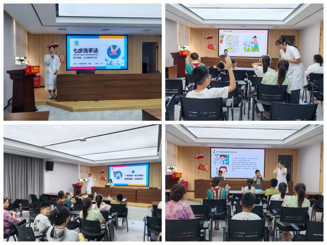 宣讲科普,播撒健康种子。在社区二楼会议室,志愿者们聚焦儿童健康素养提升开展科普宣讲。讲解员们通过科普动画、儿歌与动作示范,生动讲解“七步洗手法”要点;借助图文、故事演绎普及口腔清洁与科学用眼知识,穿插互动问答激发热情,引导儿童将健康知识带回家,让健康理念在互动中扎根。