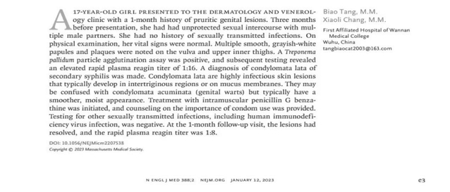 近日,我校皮肤性病学科唐彪主治医师、常小丽副主任医师病例报道被国际顶级医学学术期刊《The New England Journal of Medicine》采纳。病例报道的患者临床无明显不适症状,但结合患者发病前的生活和行为习惯,通过梅毒血清学检测,诊断为“二期梅毒”,应用予苄星青霉素规则治疗后皮疹逐渐消退,梅毒血清滴度逐渐下降。该病例因二期梅毒扁平湿疣皮疹典型并具有代表性而被《新英格兰医学杂志》采纳发表。