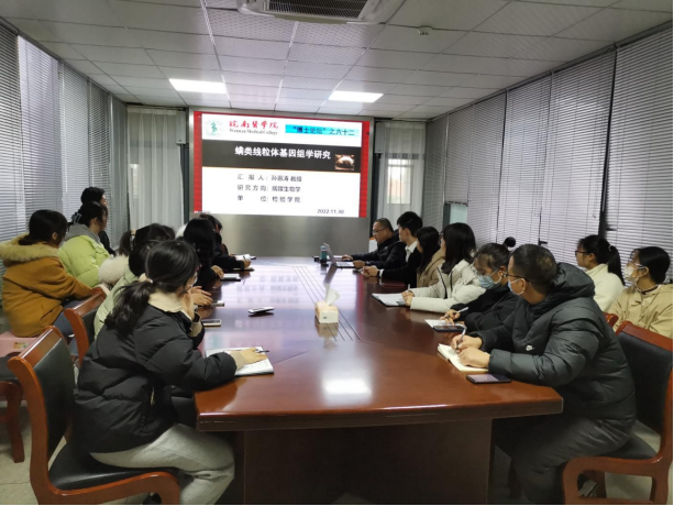 孙恩涛博士作题为“螨类线粒体基因组学研究”的学术讲座。他介绍了螨类线粒体基因组学研究现状和存在问题,从线粒体基因组的一般结构及基因重排、蛋白质编码基因、rRNA基因、tRNA基因、控制区、系统发育关系等六个方面对螨类线粒体基因组进行阐释,详细梳理了本课题组近年来报道的无气门股螨类线粒体基因组全序列的基因特征和系统发育关系等,细心分享了研究内容、研究成果及研究展望。整场报告思路清晰,精彩生动。
