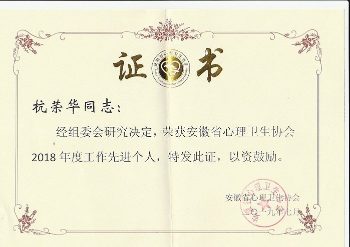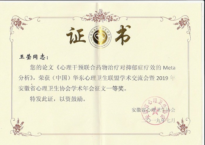 大会进行了年会学术论文的征集评选,我校2017级应用心理学专业研究生王莹的论文《心理干预联合药物治疗对抑郁症疗效的Meta分析》荣获一等奖。大会还对协会年度先进个人和先进集体进行了表彰,杭荣华教授获得“安徽省心理卫生协会2018年度工作先进个人”称号。