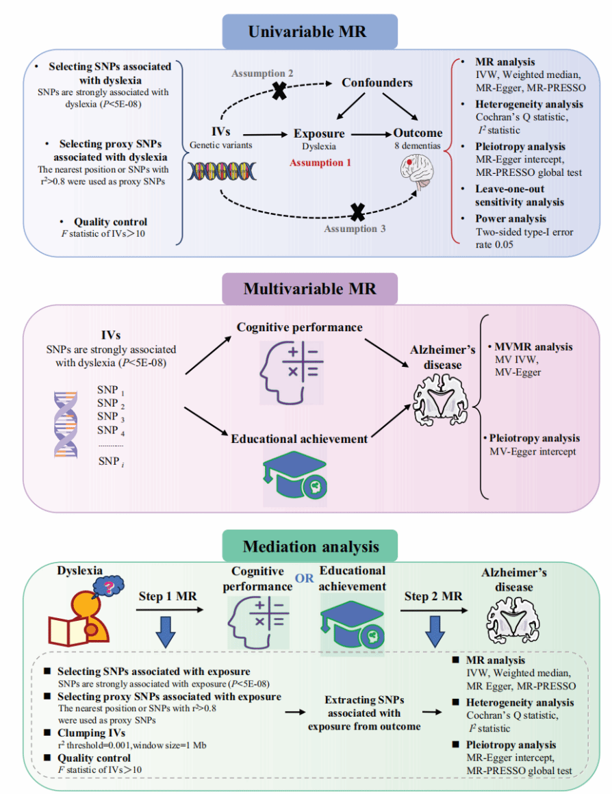 成果一:阿尔茨海默病(Alzheimer’s disease,AD)是最常见的神经系统退行性疾病,观察性和遗传学研究表明阅读障碍与AD发病风险具有相关性。然而,阅读障碍与AD风险之间的因果关系尚不清楚。团队基于大样本基因组学数据,利用双样本单变量孟德尔随机化分析,评估了阅读障碍与AD、血管性痴呆(VD)、路易体痴呆(LBD)和额颞叶痴呆(FTD)及其四种亚型风险之间的因果关系。团队发现,阅读障碍增加与AD风险增加之间存在一定因果关联(OR=1.15,95%CI:1.04-1.28,P=0.006),但与VD、LBD、FTD或其四种亚型无关联;敏感性分析也均证实了因果估计值的可靠性。多变量分析和中介分析发现,在调整认知功能后,阅读障碍与AD之间因果关联无统计学意义,由此推断认知功能介导了阅读障碍对AD的总影响(占比46.32%)。综上,该研究提供了遗传学证据,鉴定出阅读障碍与AD风险的因果关联,阅读活动有望成为改善认知功能、预防AD的干预策略。
