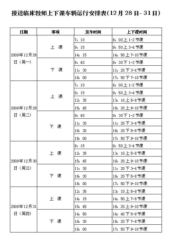 12月28日- 12月31日,部分课程结束。根据医学一系、医学二系、护理学系等部门通知,经研究决定,停发部分接送临床教师上下课车辆班次。